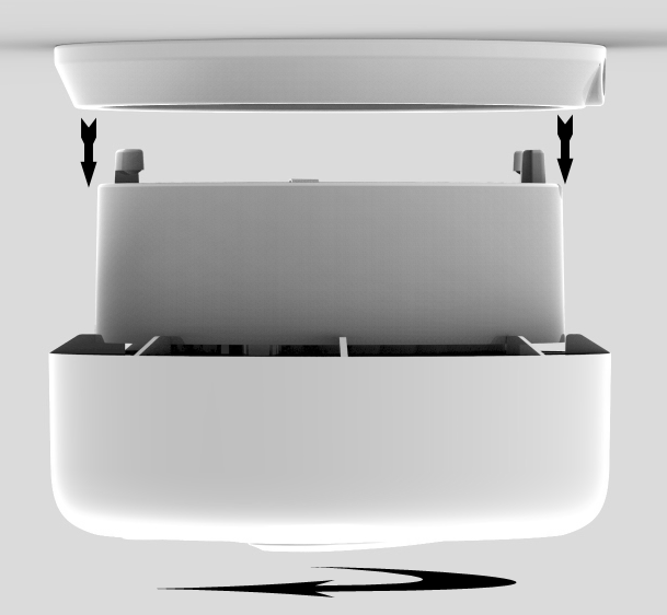 do. Włóż hak produktu do szczeliny płyty montażowej. Następnie obróć alarm zgodnie z ruchem wskazówek zegara, aż zaskoczy na miejsce.